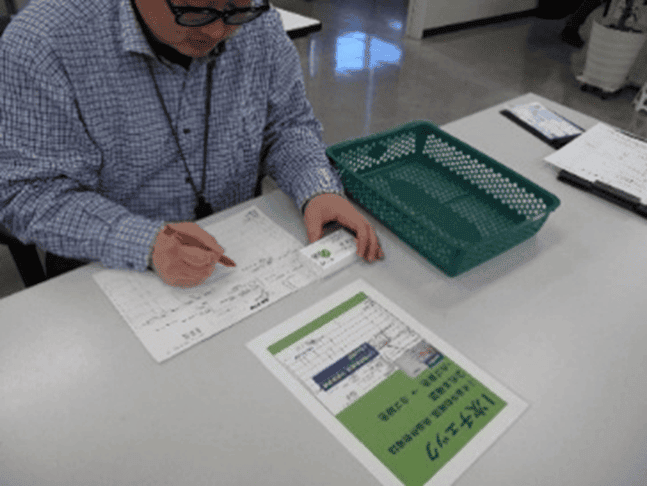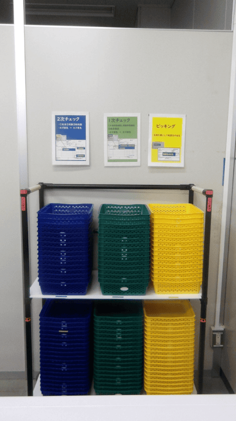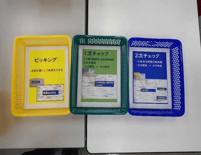 カラーで役割分担![]() ![]() ![]() 名刺の梱包・発送工程において、人名や枚数の取り違えを防ぐため「3色のカゴで状況が一目でわかる仕組み」を構築しました。 |