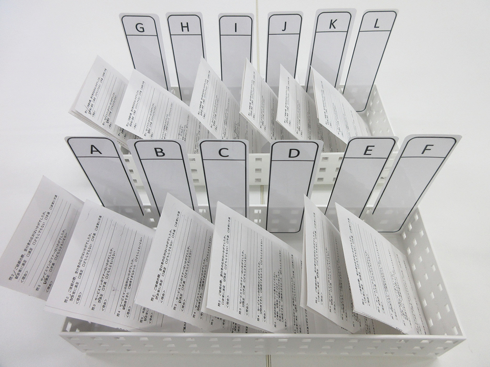 ハガキ記載のアルファベットに対応したインデックス付きボックスを作成しました。 |